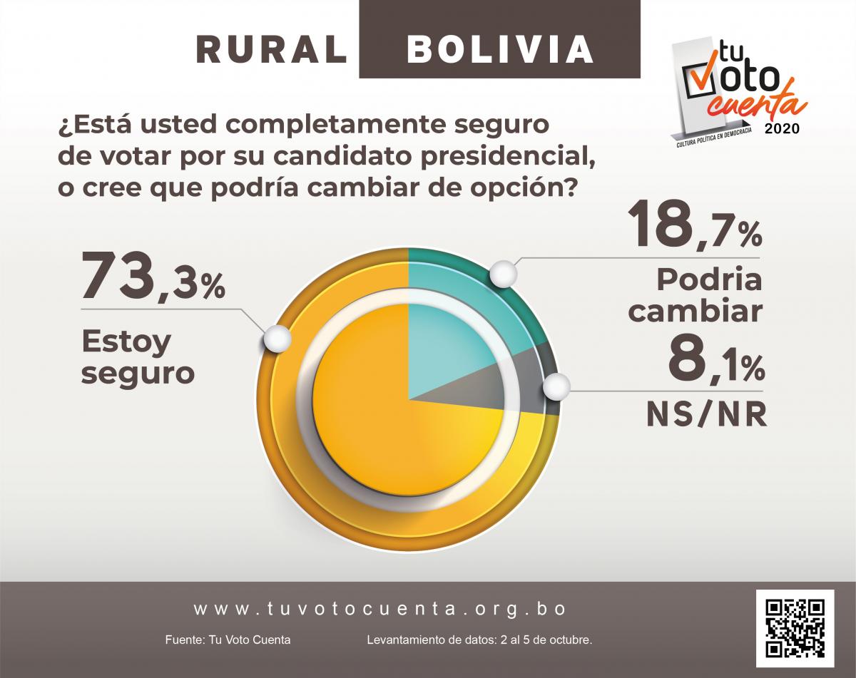En el área rural, el 73,3 por ciento ya tiene definido a su candidato por el cual votaría, y el 18,7 por ciento declaró dispuesto a cambiar y el 8,1 por ciento no sabe no responde.