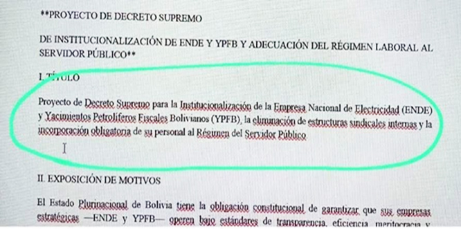 Un proyecto de decreto supremo filtrado en grupos internos de WhatsApp de los trabajadores de YPFB y ENDE encendió las alarmas sindicales al revelar una intención de trasladar a los obreros del régimen de la Ley General del Trabajo a la Ley 2027 del Estatuto del Funcionario Público. La medida implicaría la pérdida de beneficios sociales, la restricción del derecho a la sindicalización y el debilitamiento de las estructuras gremiales en el sector energético y petrolero.