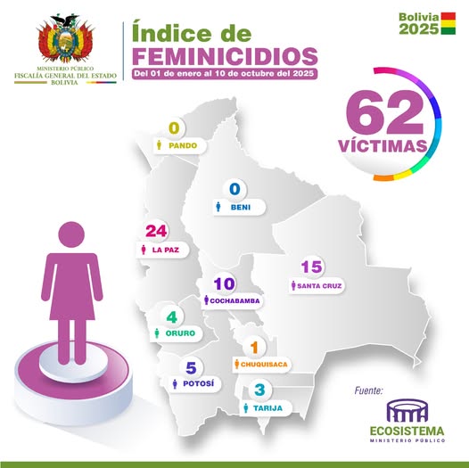 La historia de Silvia es una entre decenas. Según datos de la Fiscalía General del Estado, entre el 1 de enero y el 10 de octubre de 2025, Bolivia registra 62 feminicidios. La Paz encabeza la lista con 24 casos, seguida de Santa Cruz (15) y Cochabamba (10). Solo en Pando y Beni no se reportaron víctimas. Cada punto en el mapa representa una vida arrebatada, una familia devastada y un Estado que sigue sin lograr detener la violencia más extrema contra las mujeres.