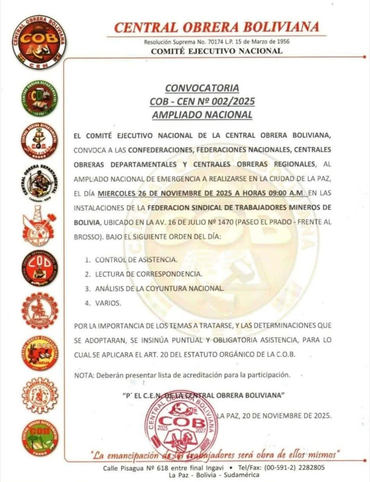 Ante ello, la Central Obrera Boliviana (COB) convocó a un ampliado nacional de emergencia para este miércoles 26, que se realizará en la sede de la Federación de Trabajadores Mineros en la ciudad de La Paz y de hecho anticiparon su rechazo a lo que califican “un atentado a la estabilidad laboral en todo el sector estatal”.