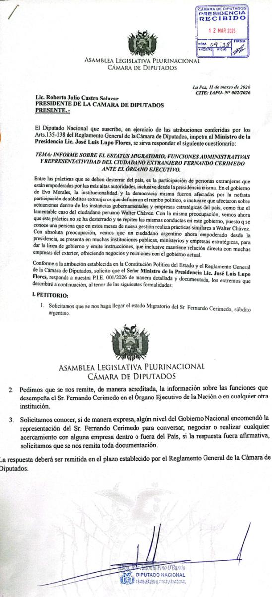 Entre los puntos solicitados, Pino pidió al ministro Lupo informar sobre el estatus migratorio de Cerimedo, detallar las funciones que cumple dentro del Órgano Ejecutivo o en cualquier otra institución pública y aclarar si cuenta con autorización oficial para sostener reuniones, negociaciones o gestiones con empresas dentro o fuera del país. En caso afirmativo, solicitó la remisión de la documentación correspondiente.