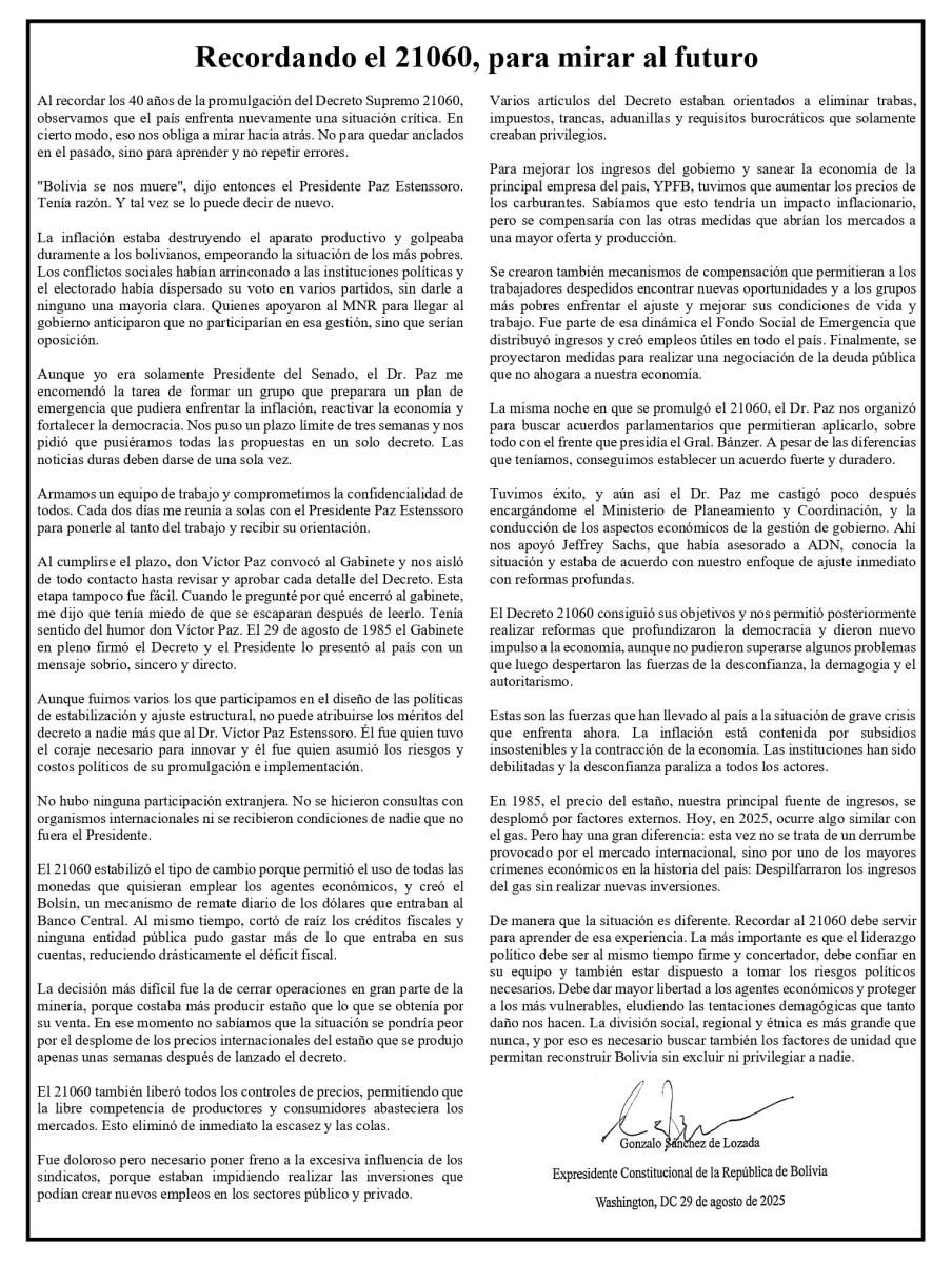 Goni, de 95 años de edad, firmó el texto con fecha 29 de agosto de 2025 en Washington DC, Estados Unidos. Fue presidente entre 1993 y 1997 y, después, entre 2002 y 2003, cuando renunció ante una movilización social y enfrentamientos que dejaron varios fallecidos. Desde entonces no regresó a Bolivia.