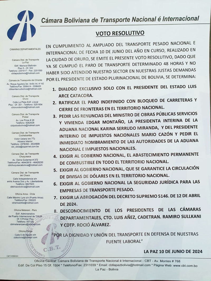 En una asamblea realizada en la ciudad de Oruro, el Transporte Pesado ha determinado un paro a nivel nacional con bloqueo de carreteras y cierre de fronteras a partir del próximo lunes 17 de junio, debido a que el Gobierno no ha atendido sus demandas.